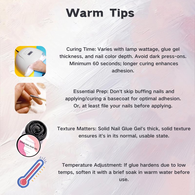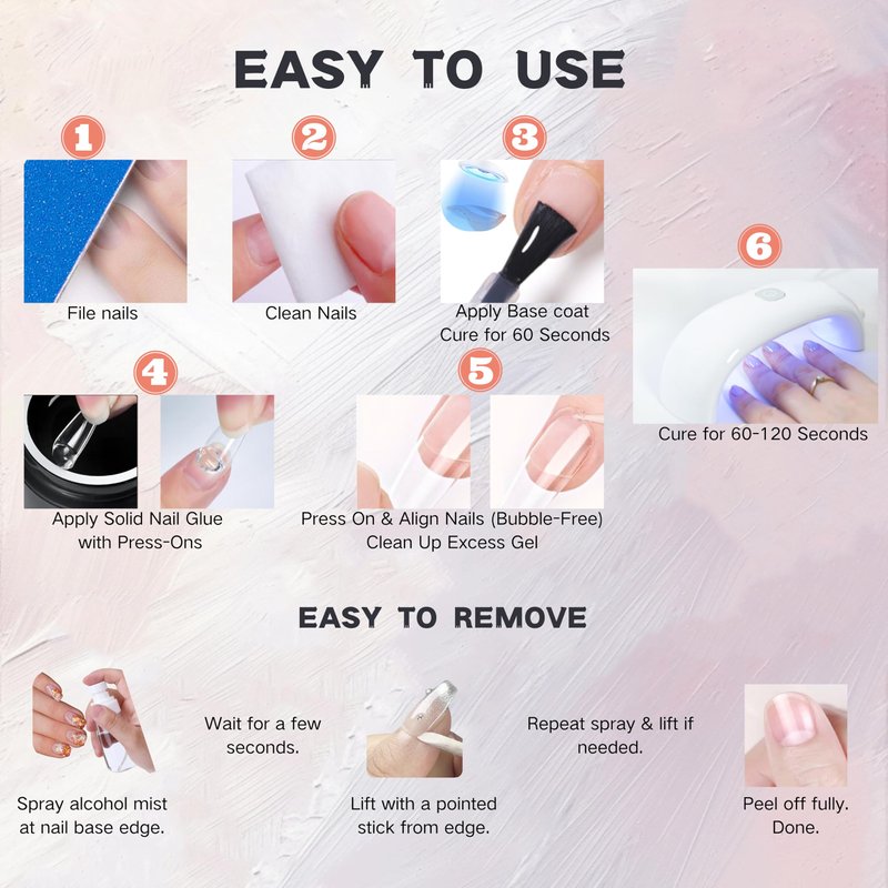 Long-Wear & User-Friendly :The solid nail glue gel feels like rubber, gentle on nails, non-drippy, and easy to handle. UV-curable for strong adhesion, it's repositionable before setting and lasts beautifully for weeks with proper use.