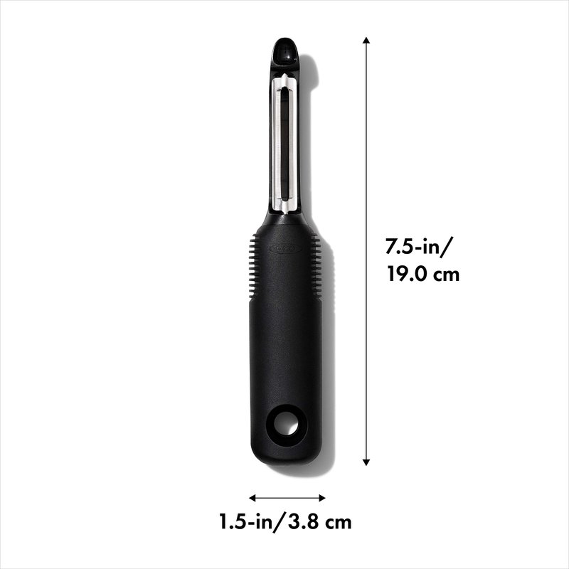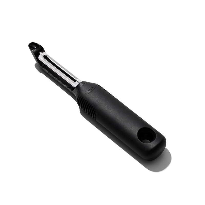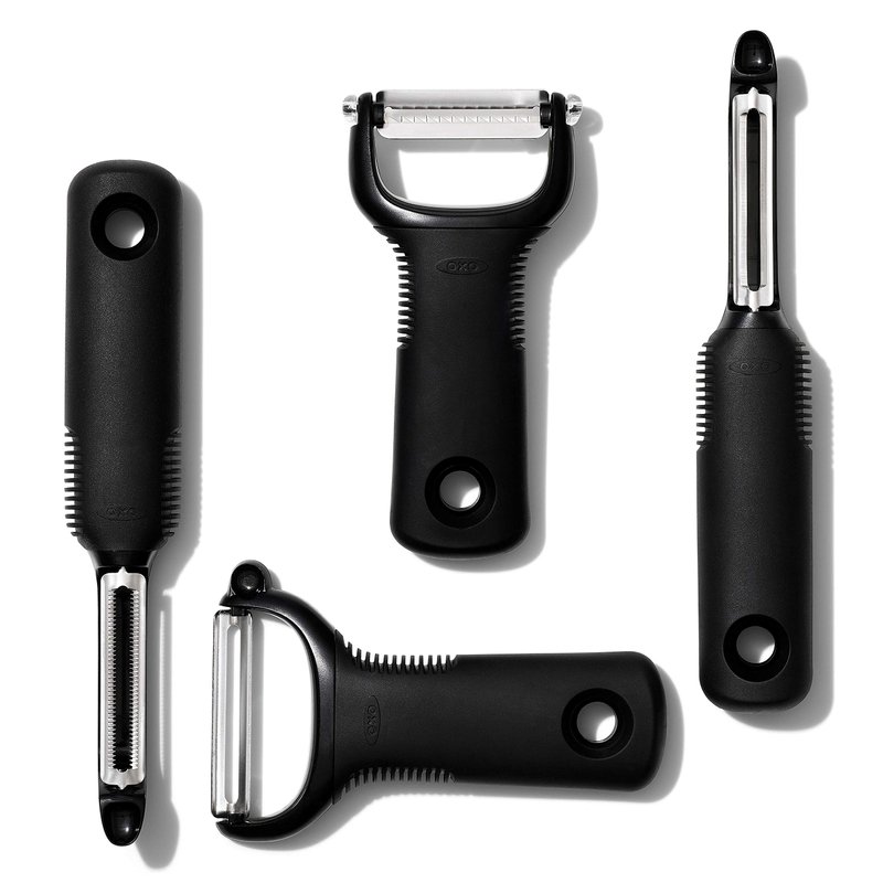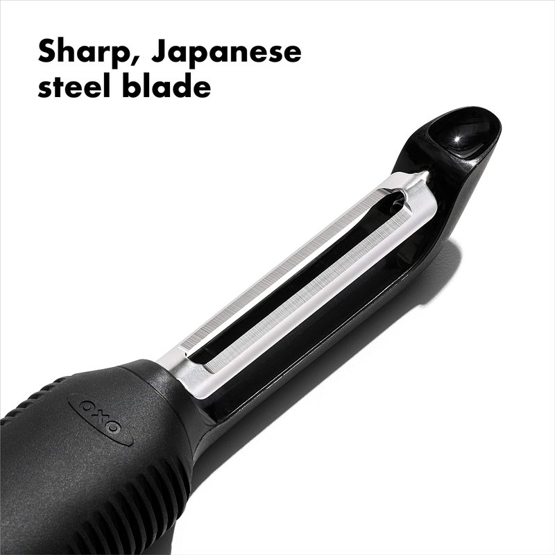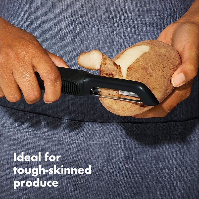 - Swiveling twin blades with flexible action easily peel potatoes, apples and other tough skinned fruits and vegetables
