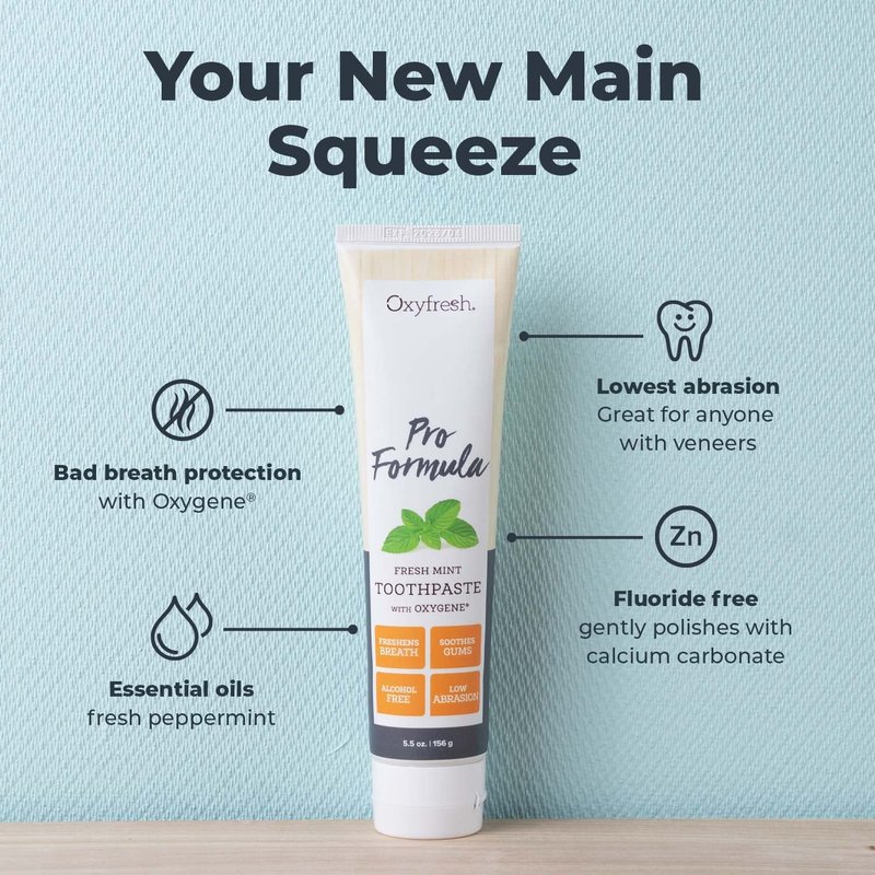 From veneers to whitening treatments, people are investing in their smiles like never before. Protecting your investment with a low abrasion toothpaste is essential for maintaining your beautiful results. Our innovative Pro Formula Fresh Mint Toothpaste delivers that protection. We don't use harsh abrasives or dyes that can stain teeth or harm dental cosmetic work. Our oh-so-gentle, minty-fresh cosmetic toothpaste has one of the lowest abrasion ratings on the market with a Relative Dentin Abrasivity (RDA) rating of only 45. (Most store-brand toothpastes have 100+ and whitening formulas are usually over 150!) Combined with our exclusive Oxygene and essential mint oil, nothing works better to protect bright pearly whites, neutralize bad breath, and deliver a completely fresh, clean feeling.
