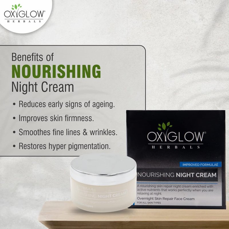 - OxyGlow nourishing night cream is composed using bees wax, glycerine, jojoba oil, pola wax, heat germ oil, almond oil, chamomile extract and various other ingredients