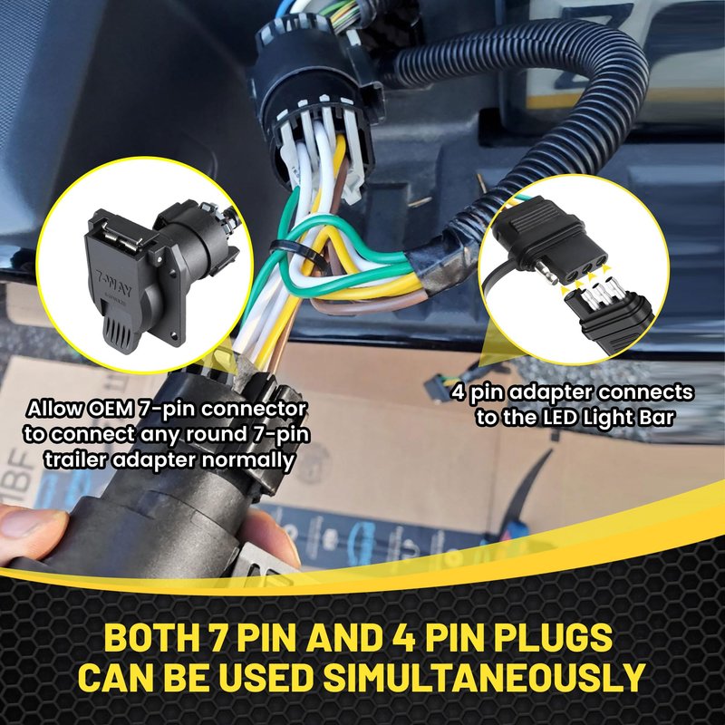 Just unplug the factory 7 pin connector from the factory holder, place the female 7 pin connector into the factory holder. Plug the factory 7 pin connector into the male 7 pin connector. Then the flat 4 pin connector is used to connect connect trailer taillights, brake lights and turn signals.