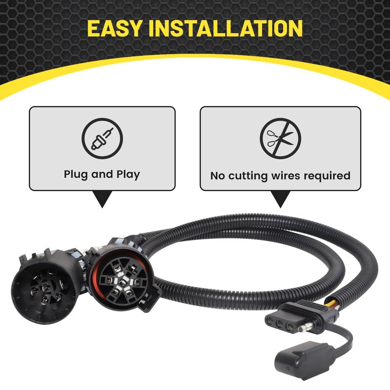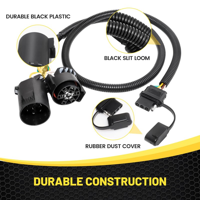 - Durable Construction. 16AWG pure copper wire makes reliable connection, 41 inches length USCRA wiring harness was well protected by a black slit loom. All 7 way USCAR plugs and 4 way connector are made from durable black plastic for long-lasting use.