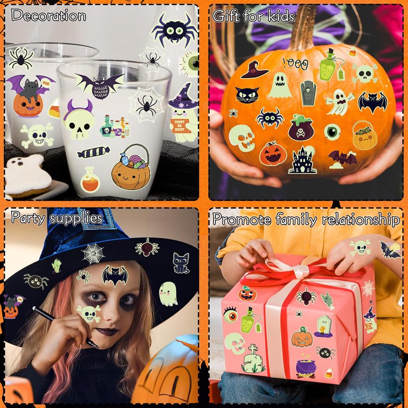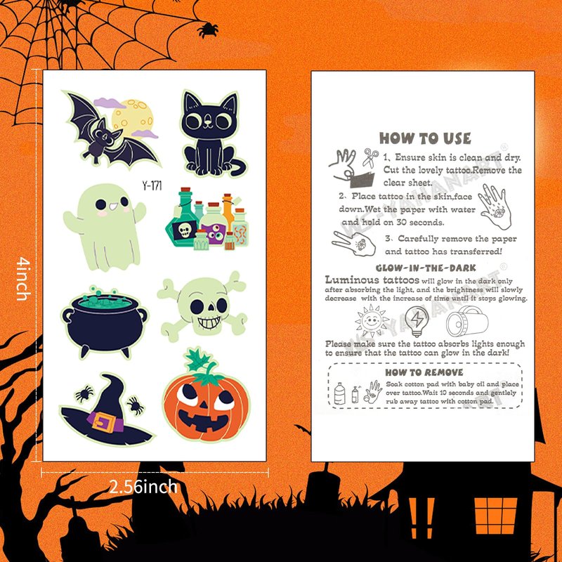 - 💀Glow Halloween Party Supplies: Illuminate your Halloween with these delightful glow-in-the-dark tattoos, sure to bring joy and excitement to kids of all ages. Whether you're dancing the night away at a festive party or embracing the spooky vibes under a starry sky, these radiant tattoos will make you the highlight of the night!