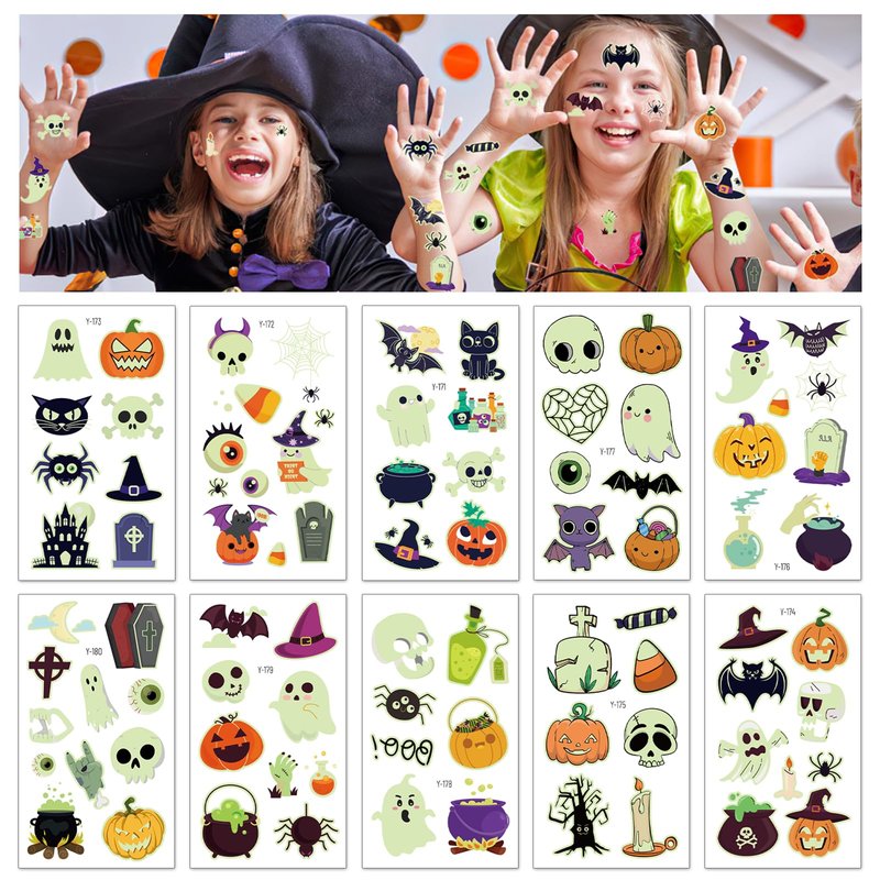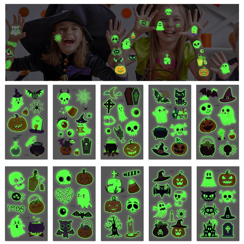 - 🎃Glow-in-the-Dark Halloween Tattoos for Kids: This vibrant set includes 10 sheets with 88 unique designs featuring playful ghosts, mischievous witches, and jolly pumpkins. These temporary tattoos add a fun, magical touch to any Halloween celebration!