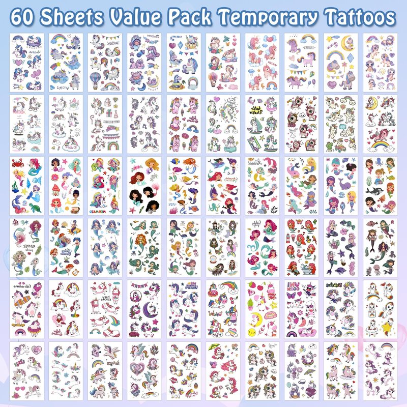- Fantasy Designs: Over 480 different unicorn and mermaid themed designs on 60 tattoo sheets.