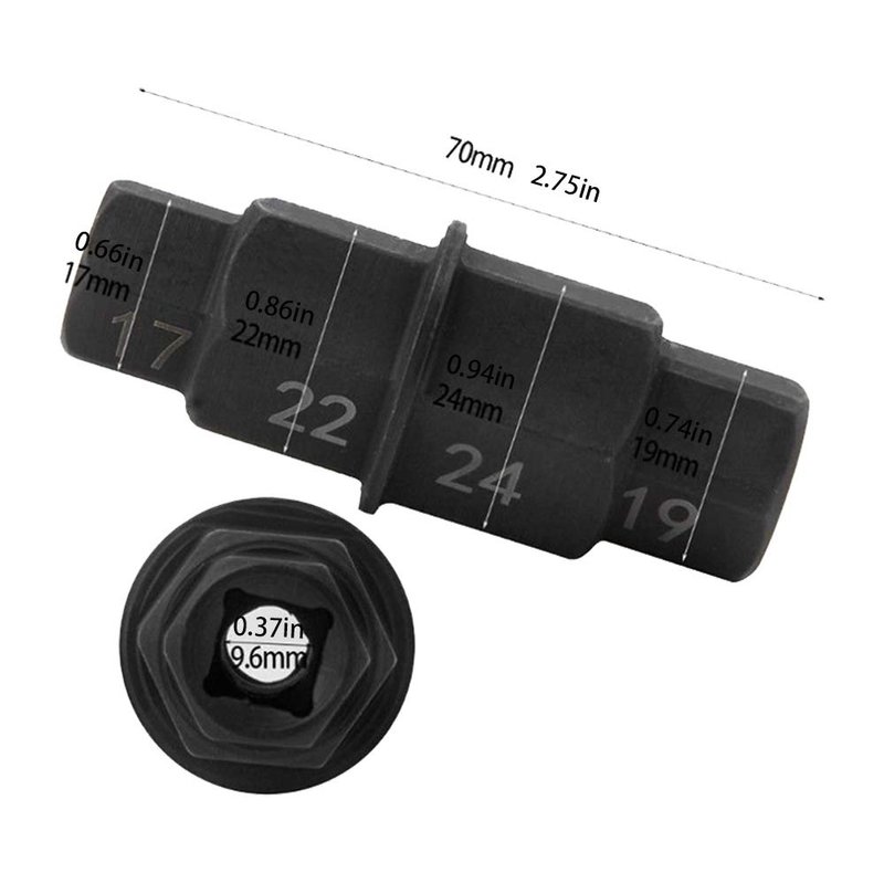 Metric hex sizes include 17mm, 19mm, 22mm, and 24mm. The 19mm side can be used with a 3/8 inch drive ratchet or an open-end wrench, and the 17mm side can be used only with an open-end wrench