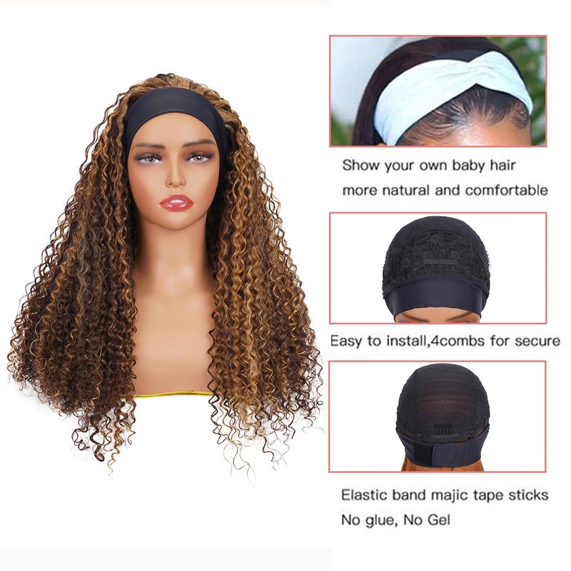 P4/27 Highlight Curly Headband Wig Human Hair 16 Inches Human Hair Headband wig Kinky Curly None Lace Front Wigs Human Hair Wig for Black Women Wear and Go Wig 150% Density wig