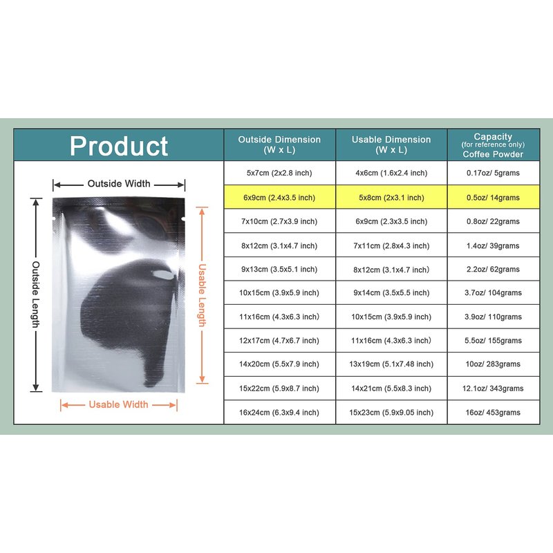 Features 1. Material: Foil 2. Design: Open Top, with Tear Notches 3. Thickness: 0.08mm (3.1 mil)( one side)4. Color: Fully Silver5. Available Size:Outside Size: 5x7cm(2x2.8 inch) ; Usable Size: 4x6cm (1.6x2.4 inch) Outer Size: 6x9cm (2.4x3.5 inch) ; Inner Size: 5x8cm (2x3.1 inch)Outer Size: 7x10cm (2.7x3.9 inch) ; Inner Size: 6x9cm (2.3x3.5 inch)Outer Size: 8x12cm (3.1x4.7 inch) ; Inner Size: 7x11cm (2.8x4.3 inch)Outer Size: 9x13cm (3.5x5.1 inch) ; Inner Size: 8x12.4cm (3.15x4.88 inch)Outer Size: 10x15cm (3.9x5.9 inch) ; Inner Size: 9x14cm (3.5x5.5 inch)Outer Size: 12x17cm (4.7x6.7 inch) ; Inner Size: 11x16cm (4.3x6.3 inch)Outer Size: 14x20cm (5.5x7.9 inch) ; Inner Size: 13x19cm (5.1x7.48 inch)Usage 1. The open filling bag can be vacuum sealed as well as heat sealing the open top 2. Used for coffee; candy; sugar; baking; cookie; snack; leisure food; decorations; accessory and so on