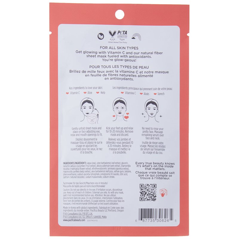 Pacifica Beauty, Glow Baby Brightening Face Mask, Sheet Mask, Skincare, Vitamin C, Aloe, Kelp, Brightening, Glowing Skin, Dullness, Fine Lines, Dark Spots, Dry Skin, Vegan & Cruelty Free
