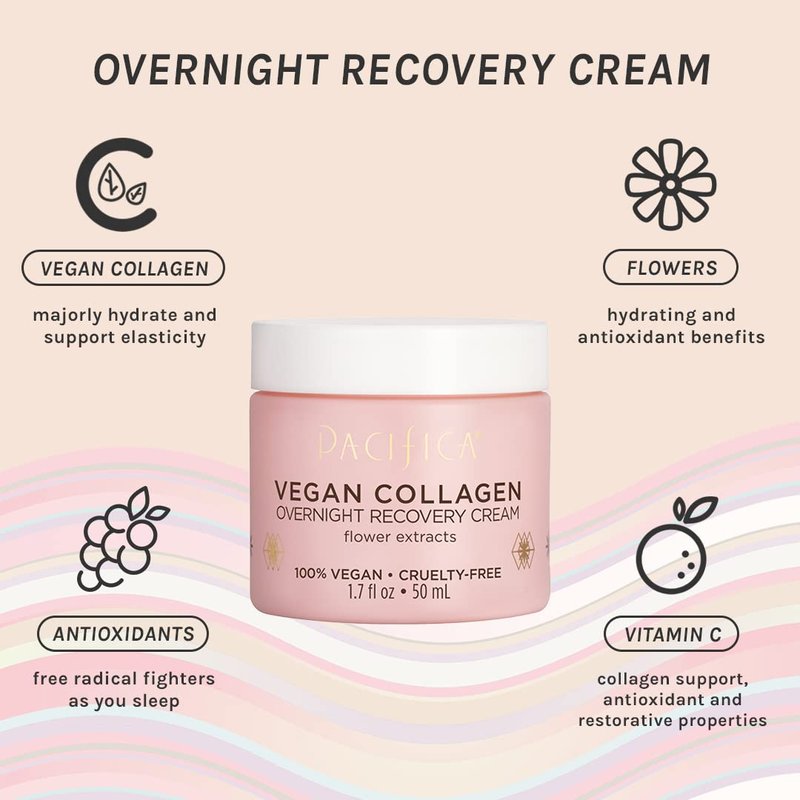 - VEGAN COLLAGEN OVERNIGHT RECOVERY CREAM this rich formula with essential lipids and antioxidants, help revive and quench the thirstiest skin