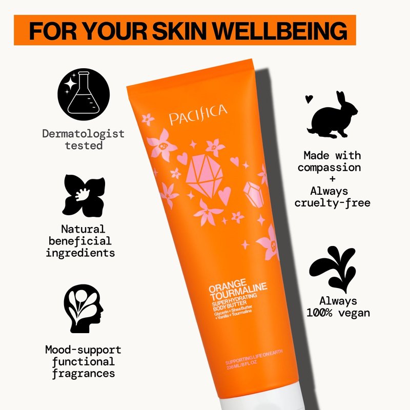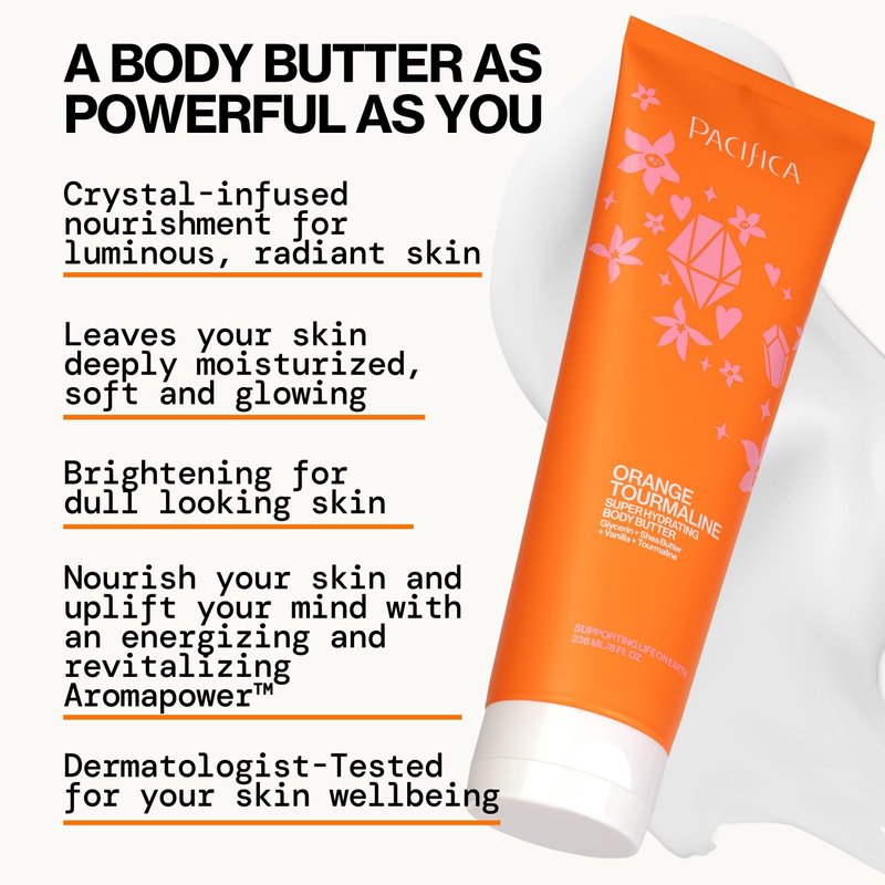 - FREE OF HARSH CHEMICALSCLEAN BEAUTY, VEGAN & CRUELTY-FREE: Crafted according to Pacifica’s strict clean beauty standards, our Orange Tourmaline Body Butter is 100% vegan, cruelty-free, and dermatologist-tested. Formulated without parabens, phthalates, sulfates, synthetic fragrances, and mineral oils, this nourishing body cream is gentle enough for sensitive skin. Feel good about choosing skincare that aligns with your ethical values and leaves skin luxuriously hydrated.