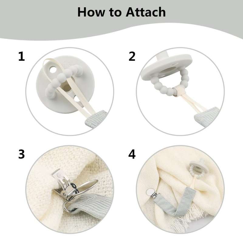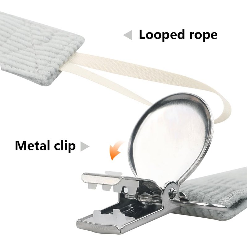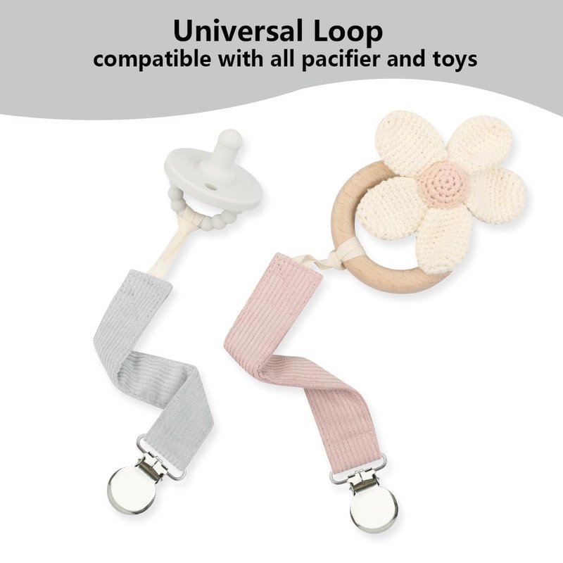 - UNIVERSAL CLIP-The strap is a universal pacifier leash designed with a loop to be compatible with all types of pacifiers. It can hold soother, burp cloths, teething rings, baby blankets, and drool bibs.