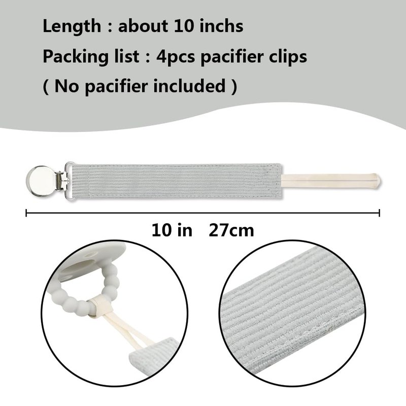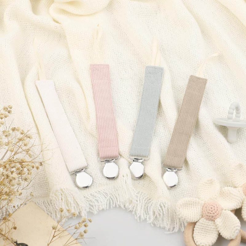 *Product Details: Material: Linen Soft Fabric Strap and stainless steel clip Ingredient: BPA Free, Phthalate Free, Latex Free, Lead Free, *Total length: 10 in *Color: beige,pink, green,brown *Packaging includes: 4Pcs Pacifier Clips Why to choose our pacifier clip: *Soft, gentle, comfortable and safe to babies *Sturdy and durable clip on clothes without tearing clothes Keep the pacifier or toy don't lose and clean Easily wash it with soapy water and then air dry, no rusting after long time use *4 different colors and modern design perfect for girls and boys *Works with universal pacifiers, teething toys or soothie A cute gift for your cute babies, they will love these pacifier clips