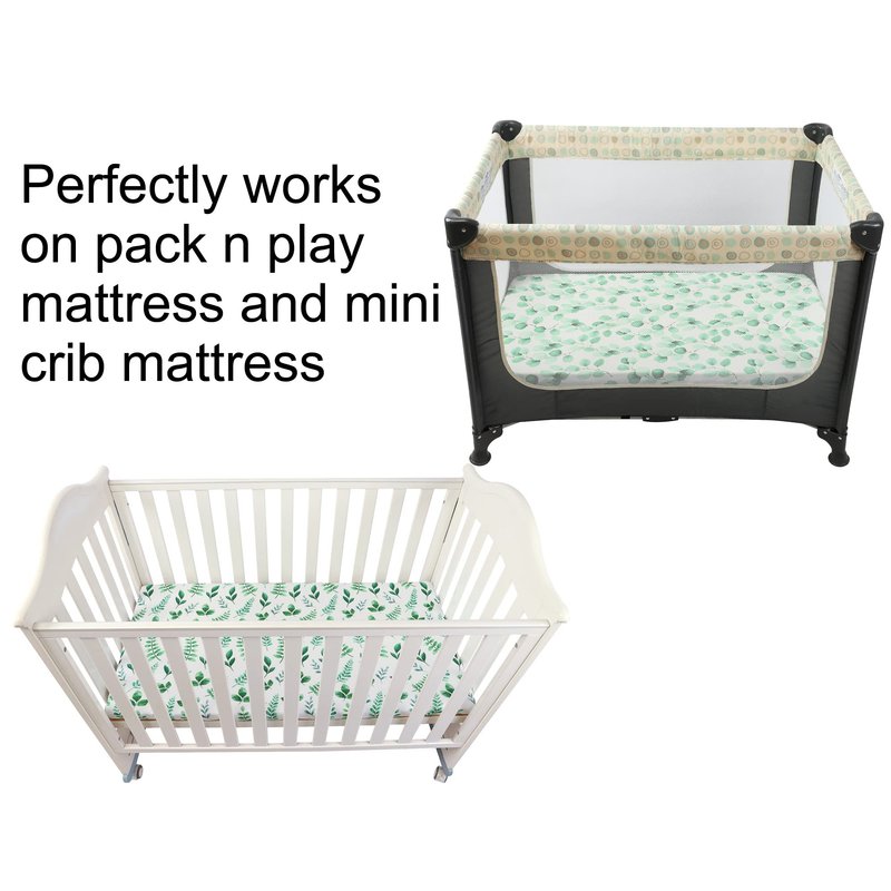 Soft and skin-friendly pack and play sheets will keep baby comfy during playing/ sleeping. Our jersey knit playard fitted sheets will be a best option for you and your little baby. FEATURE Universal size Each sheet measures 38"x24"x5", this size allows you to fit our stretchy sheets on pack n play mattress and mini crib mattress which sized 39" x 27" x 3", 37" x 25.5" x 3", 38" x 24" x 5". 360°elastic band Our sheets stay in place due to the elastic that goes all the way around. Adorable design Watercolor seamless pattern of green herbs and eucalyptus leaves on white background, our pack n play sheet match any style baby's bedding. Soft, skin-friendly fabric Our portable mini crib sheets are made of premium quality jersey knitted fabric, hypoallergenic and beathable, gentle to touch, safe for baby delicate skin. CARE TIPS: Warm gentle machine wash separately before use Don't bleach Tumble dry on low heat