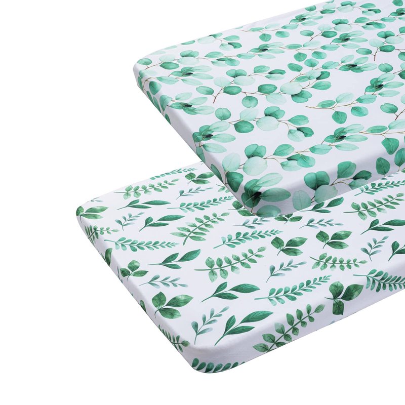 Pack n Play Sheets 2 Pack for Baby Unisex, Stretchy Jersey Knitted Portable Mini Crib Sheets Playard Mattress Cover for Baby Boys and Girls, Watercolor Green Botanical Leaf