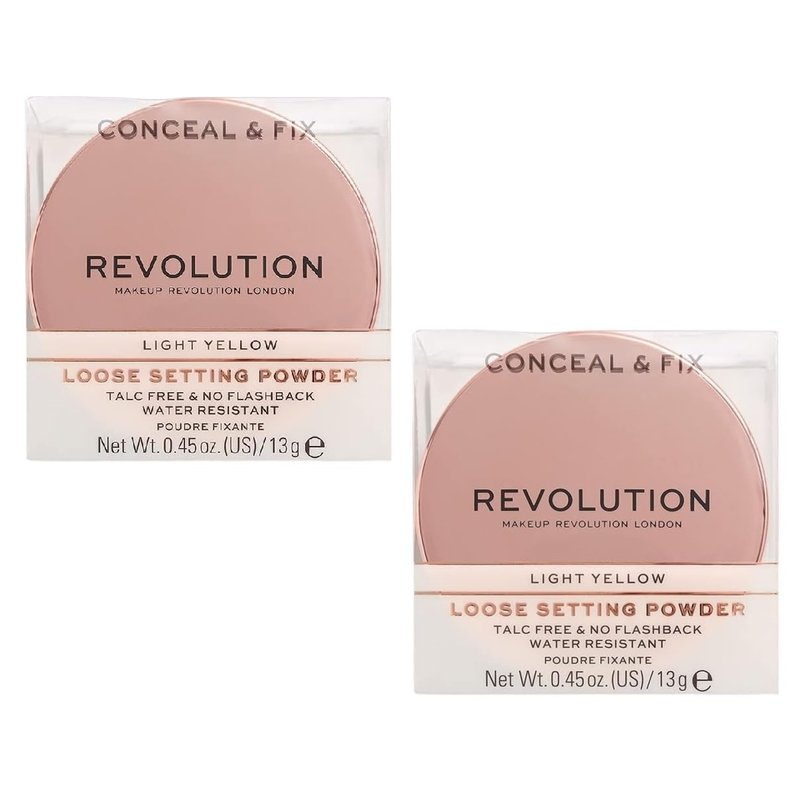 - Pack of 2 Makeup Revolution Beauty Conceal & Fix Setting Powder, Light Yellow Light Yellow – Perfect for light yellow tones Water resistant, completely flashback free & talc free to give any look some serious staying power. 0.45 oz / 13 g x2
