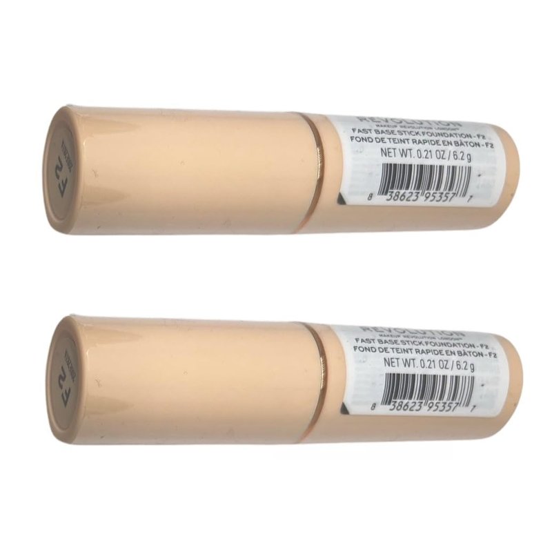 - Pack of 2 Makeup Revolution Beauty Fast Base Stick Foundation, F2 F2 – For fair skin tones with yellow undertone The easy-to-apply stick formula melts into skin, blending seamlessly to leave a fresh and dewy finish. Twist up, swipe on and blend out with fingers, a BEAUTY SPONGE or your favourite MAKEUP BRUSH. 0.21 oz / 6.2 g x2 Made in Taiwan