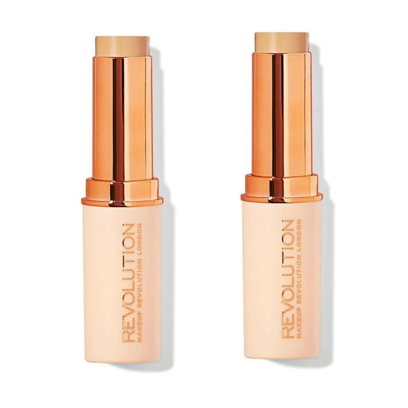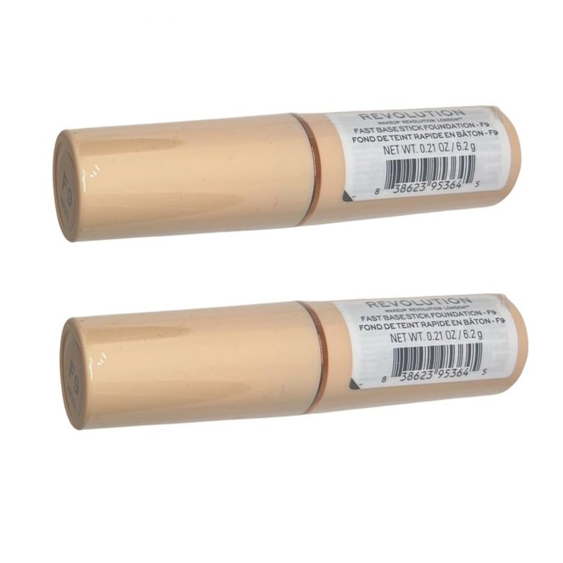 - Pack of 2 Makeup Revolution Beauty Fast Base Stick Foundation, F9 F9 – For medium skin tones with a peach undertone The easy-to-apply stick formula melts into skin, blending seamlessly to leave a fresh and dewy finish. Twist up, swipe on and blend out with fingers, a BEAUTY SPONGE or your favourite MAKEUP BRUSH. 0.21 oz / 6.2 g x2 Made in Taiwan