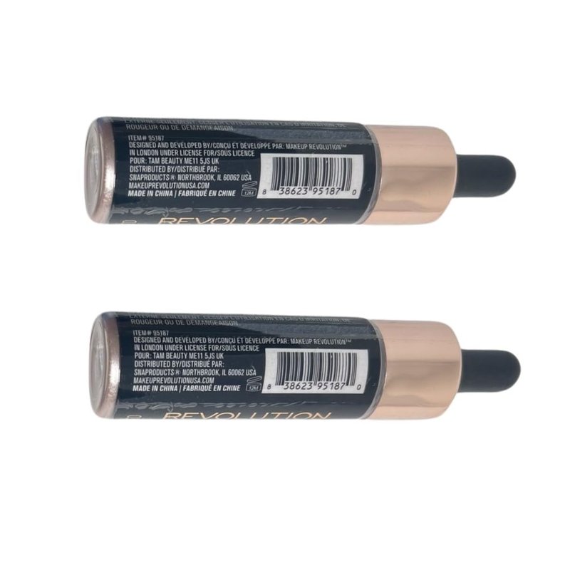Pack of 2 Makeup Revolution Beauty Liquid Highlighter, Starlight Highly concentrated highlighter to enhance and give a luminous finish to your skin. Liquid drops that can be added to your skin care or body lotion to create all over natural glowing.