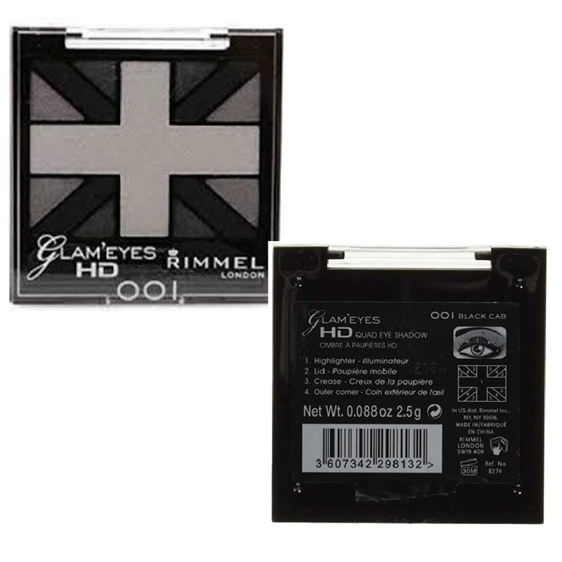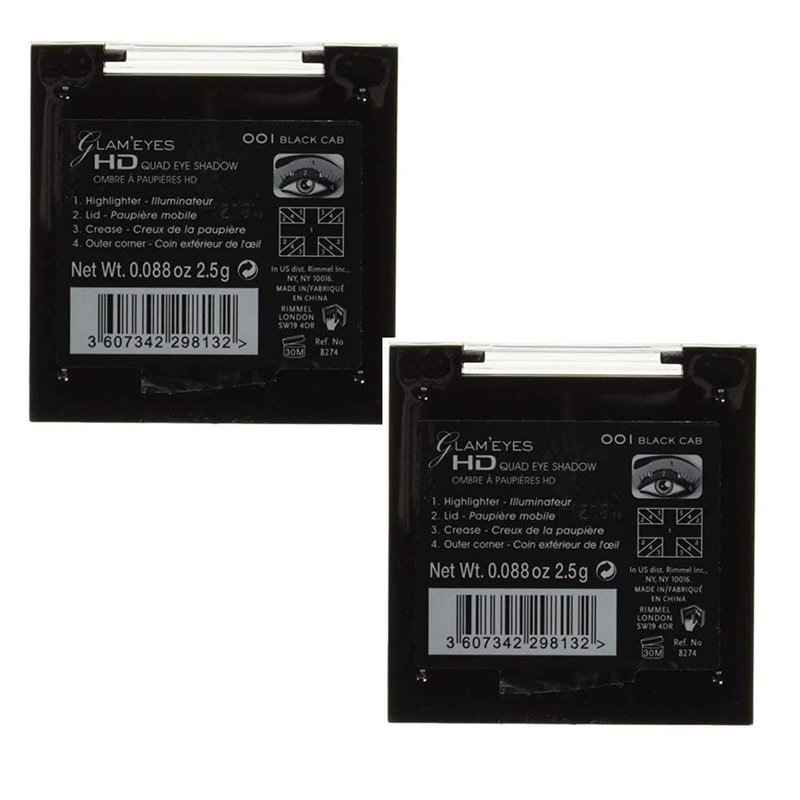 Pack of 2 Rimmel London Glam Eyes HD Quad Eye Shadow, Black Cab 001 Multi-reflective pigments eyeshadows for colour that looks perfect under any light. 1. Highlighter. 2. Lid. 3. Crease. 4. Outer corner. 0.088 oz / 2.5 g x2
