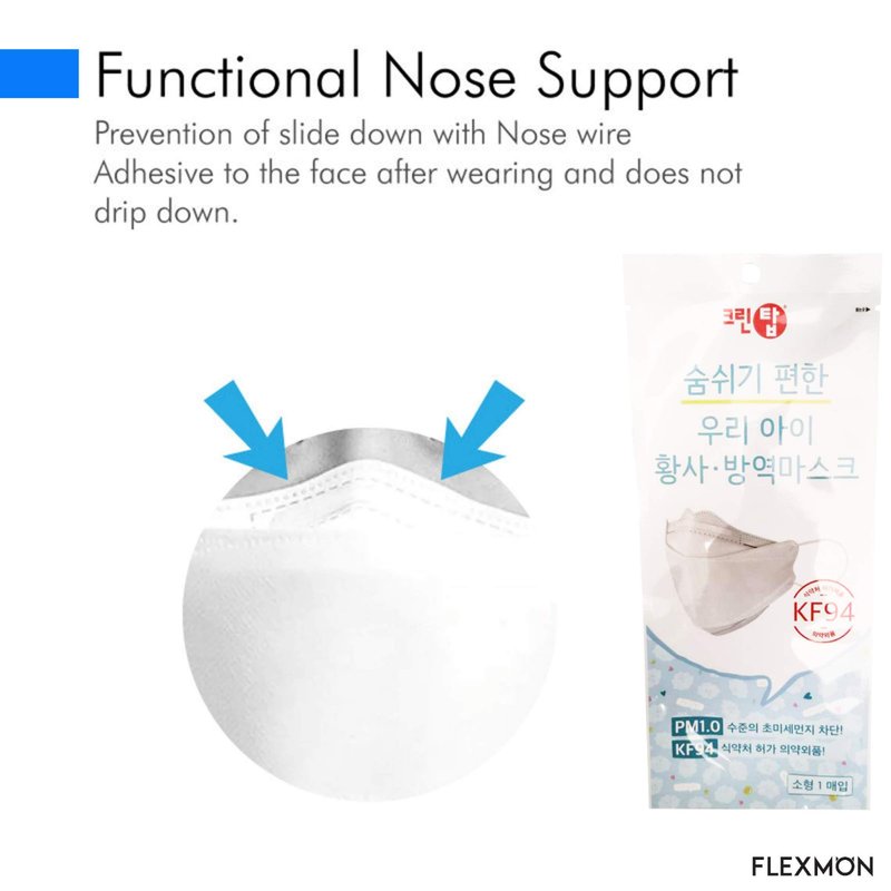 - FLEXMON KIDS KF94 WHITE FACE MASK: (Kids Mask, Age 3-9 Old) / (PREMIUM QUALITY) All materials are made in Korea with premium quality. Tri-folded structure and hygienic individual packaging.