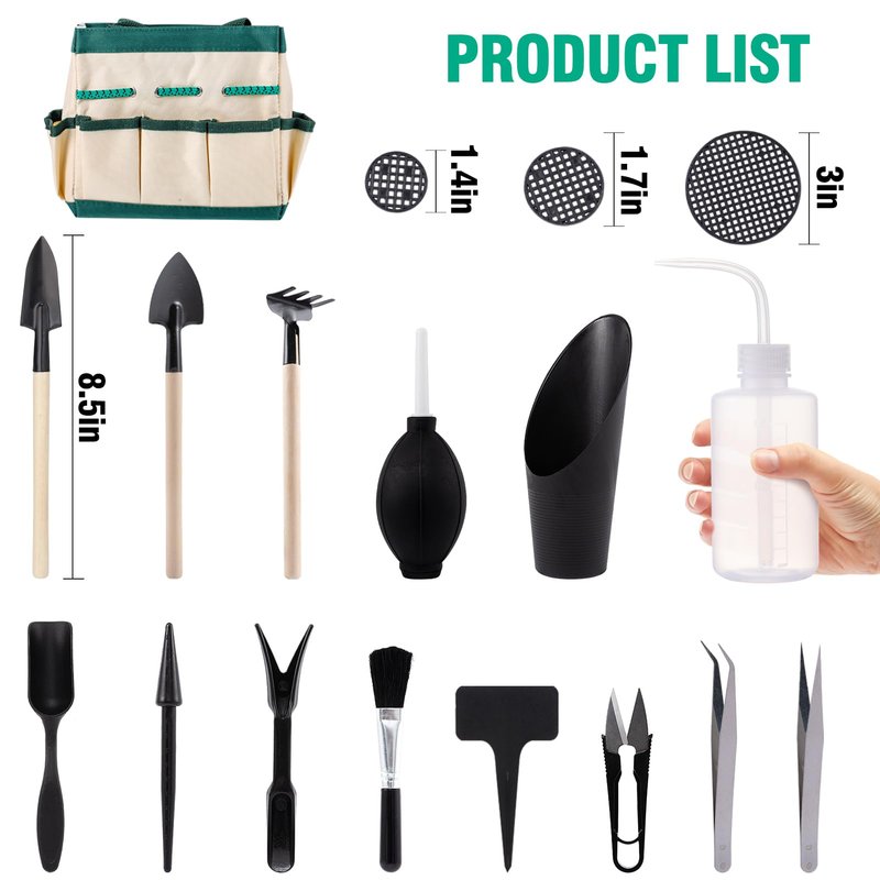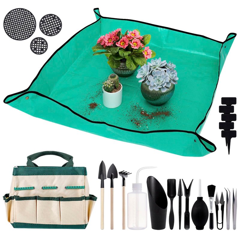 - Sufficient Tools: You will receive 1 piece of 39.4 × 39.4 inches green plant transplanting tarp mat, 1 × storage bag, and 19 pieces of different mini succulent tools, including shove, spade, rack, air dust blower, scissors, curved mouth drip bottle, 5 plant labels and so on, 24 x planter mesh pads (3 sizes: 1.4in 1.8in 3in ) meeting your different needs for various occasions.