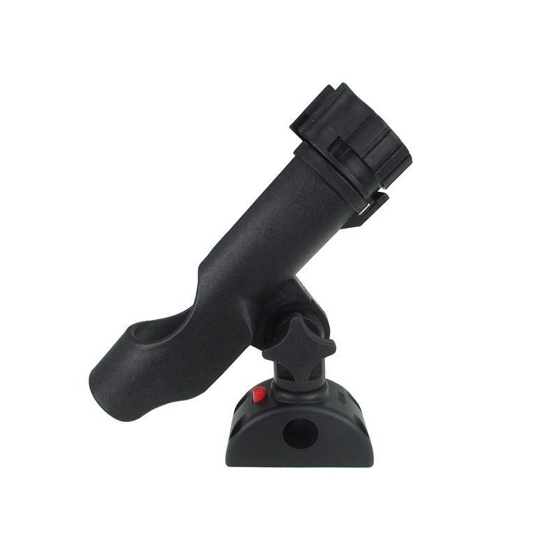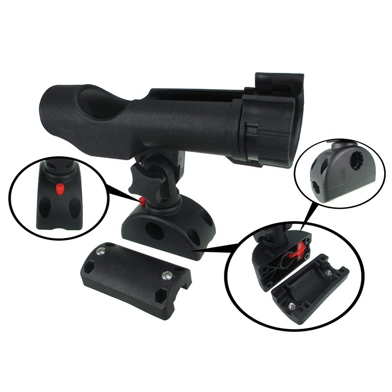 Swivels Laterally and Tilts up and down. Its can be able to hold your fishing rod in place. Rapid-release latch mechanism is easy to find. 180 degree vertical adjustment allows for different rod tip height setting and rod storage when traveling. Has Multiple and securely locked positions. A sliding ring allows quick insertion and removal of rods. Large, easy-grip lock nut offers simple adjustment. Made of durable, high impact fiber-reinforced structural quality PP ( Polypropylene ) Item: P54079RBKSQ