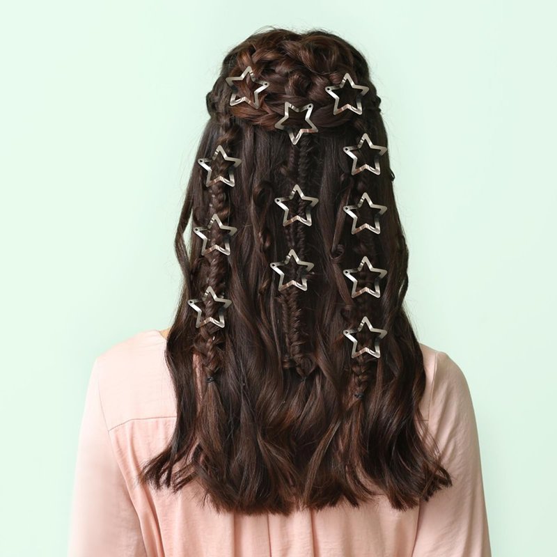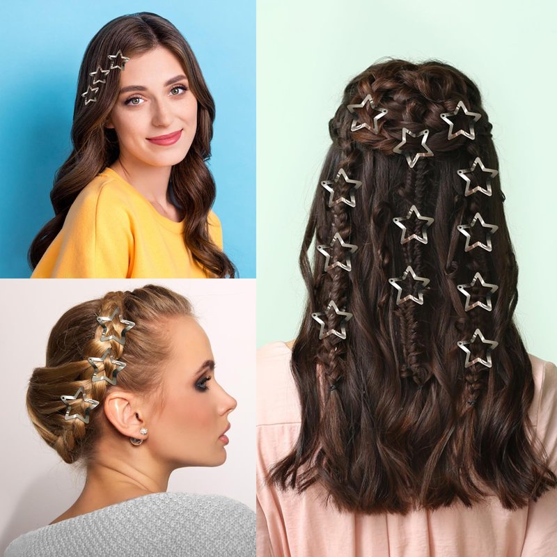 - Silver Star Hair Clips:These cute star hair clips are the pentagram Snap clips. The star hair clip has a silver coating that gives off a unique metallic shine. Small Star Hair Clip is a decorative hair clip that every punk girl can't resist!The details are polished, so you don't have to worry about hurting your scalp and hair.