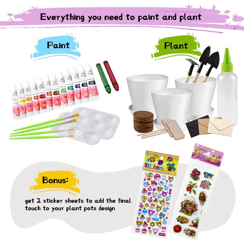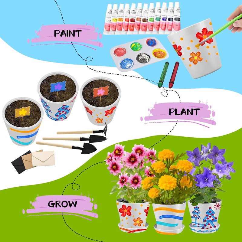 - EVERYTHING YOU NEED TO PAINT AND PLANT: The Paint and Plant Garden Kit has everything you need - 3 pots with trays, 12 colors of paint, 4 paintbrushes, 2 palettes, 2 graffiti pens, 3 pieces of nutrient-rich soil, 3 small digging tools, 3 seed packets (COSMO, ZINNIA, MARIGOLD), 3 plant markers, and 1 cute watering bottle. Bonus: You'll even get 2 stickers to put the finishing touches on the kids' planters.