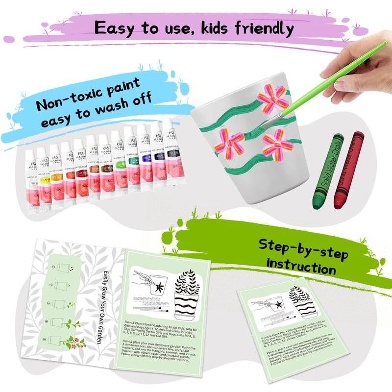 - LET YOUR CHILD HAVE FUN AND GROW: This paint and plant garden kit is a fun and educational gift! Kids will quickly fall in love with it. Looking at the patterns they have painted, watching the flowers they have planted grow healthily, and looking at what they have created will make children feel very proud and happy. At the same time, it improves the child's creative ability, cultivates the pursuit of art and love for plants, and cultivates patience and responsibility.