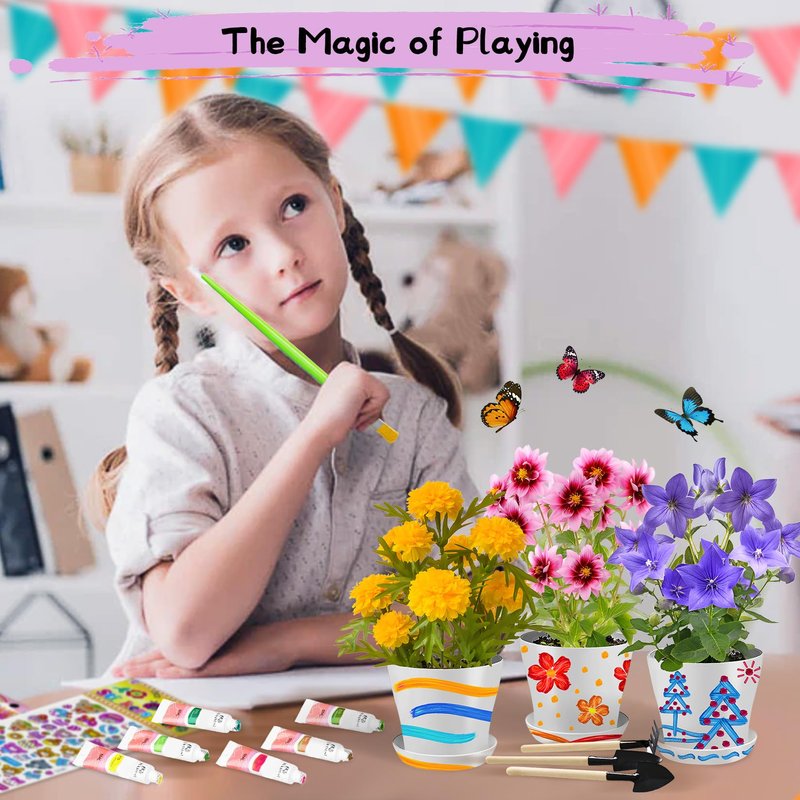 - MAKE IT UNIQUE: A child's imagination is limitless when it comes to creating! Children are free to express their creativity on pots, trays and plant markers. They will have fun creating three unique planters, nurturing colorful flowers, and then adding sparkle and vibrancy to the entire home. Decorate each planter in your child's unique style, then plant seeds for colorful flowers and watch them grow. Kids will love their new garden!