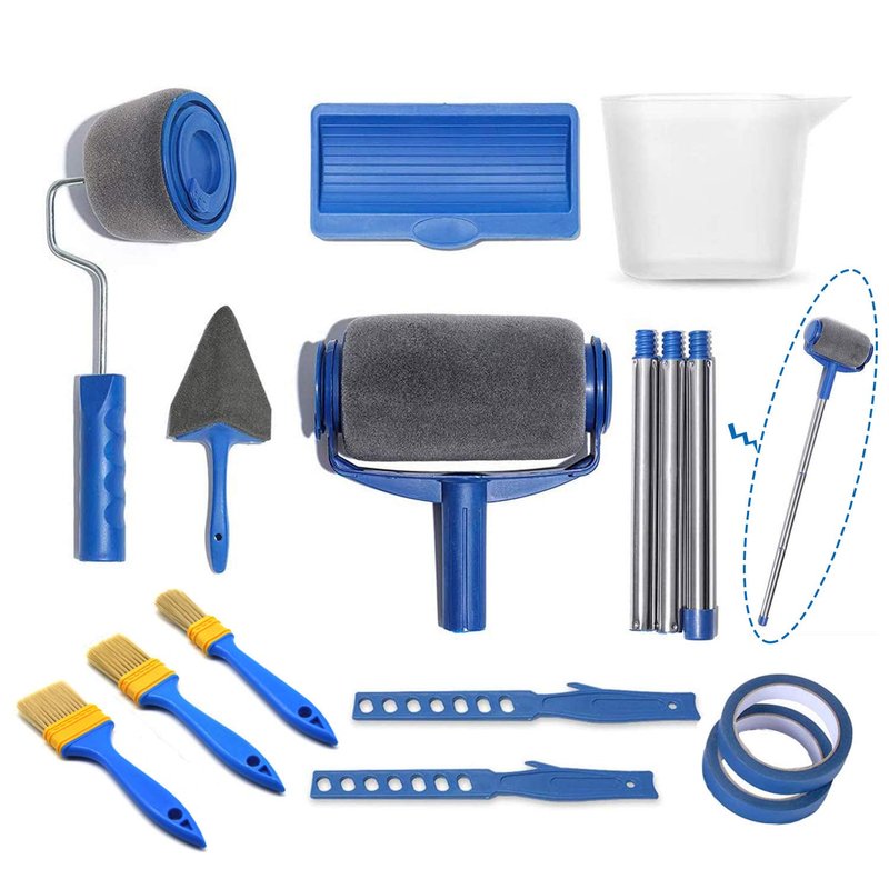 - All in One Multifunctional Paint Roller Set - The painting roller kit includes 15 Pcs tools. 1 Rechargeable Paint Roller Pro; 1 Corner Cutter; 3 Extension Stick; 1 Paint Measuring Pour Jug; 2 Plastic Paint Stick; 1 Fine Flocked Edger; 2 Masking Tape (0.8inch x 788inch); 1 Resting Tray, 3 Paint Brushes(1 inch; 1.5 inch; 2 inch). The paint roller kit can meet all your needs for painting.