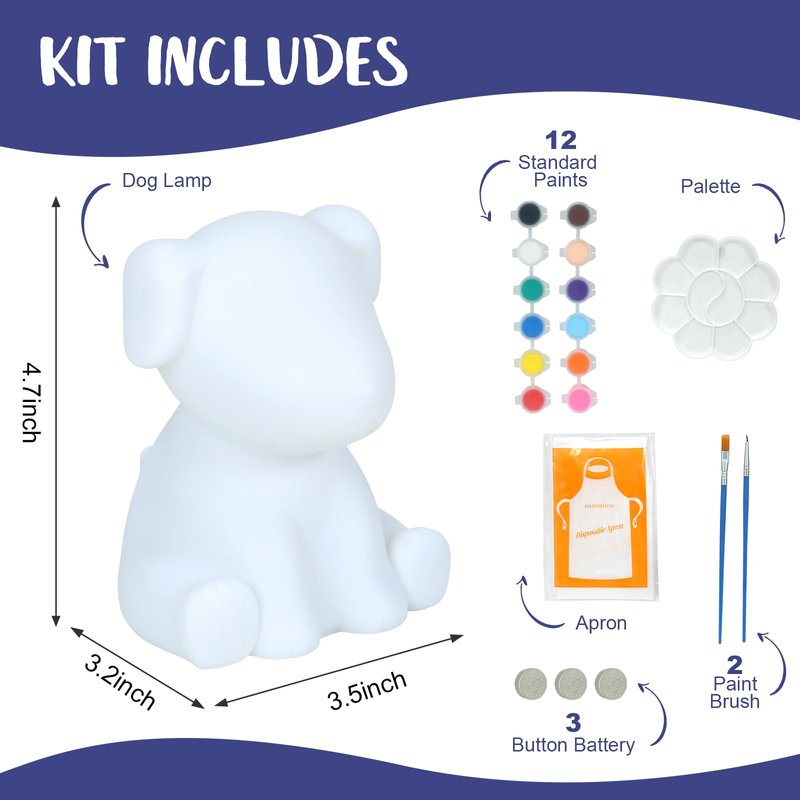 - PAINT AND CREATE YOUR OWN CAT AND DOG LAMP KIT: This combo craft set includes Cat and Dog Lamp, 12 Paint Pots, 2 brushes,1 palette, 1 apron. Plus we gift an extra 6 batteries, providing a fun and enriching experience as a complete art kit. A great value for educational coloring toys suitable for kids ages 6-14.