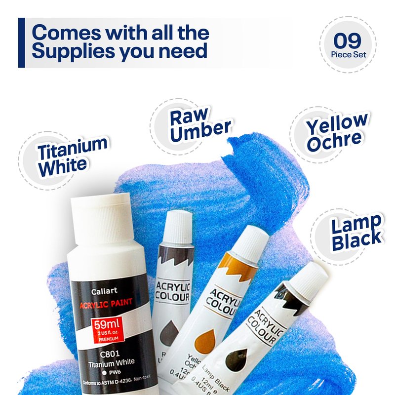 - Comprehensive 9-Piece Acrylic Painting Kit: Our painting kit includes all the materials needed to bring your creativity to life. High-quality acrylic paints, a durable paint palette, a set of brushes, graphite paper, and a canvas panel. Use the exact same materials as the instructor for a seamless, enjoyable painting experience from start to finish.