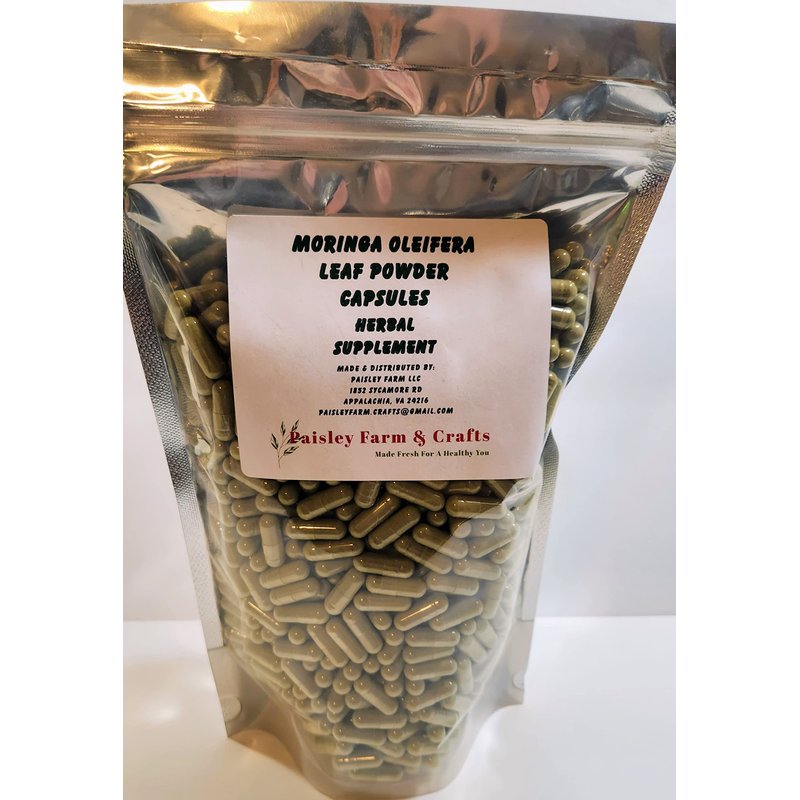 Moringa Leaf Powder Capsules - Multi Sizes Available - Made Fresh On Demand! Experience the amazing benefits of the herbal supplement Moringa Leaf in capsule form from a company you trust! In business since 2013, we at Paisley Farm and Crafts [Paisley Farm LLC] make it our mission to manufacture our capsules on demand so they aren’t made to ship until you order. Our organic powder arrives through a U.S. based importer and is purchased in small batches to ensure the freshest quality. *Please note powder color may be different than what is pictured or from past purchases. Powders are purchased in small quantities and different drying methods can cause a difference in the color of the powder. Drying methods that are used are flash freezing or natural and both do not lower the strength and quality of the powder. Suggested serving size: as a dietary supplement for adults, take 1-500 mg capsules 3 times a day or as recommended by a healthcare professional. Ingredients: Dried/ground Moringa Leaf Capsules: vegetable capsules 100% plant-derived material (HPMC: hydroxy, propyl, methyl, and cellulose) (HPMC is a wood pulp derived from the softwood tree species including Pine and Spruce), Purified water. All capsules are bagged and shipped in a foil lined pouch with silica gel packs to help protect against moisture. Please store in a cool, dry place to ensure capsules don’t sweat in warmer weather. Thanks for shopping with us, Linda *Please note that Paisley Farm and Crafts is not a physician or medical facility. Please consult your healthcare professional before use. *These statements have not been evaluated by the FDA. This product is not intended to diagnose, test, cure or prevent any disease.