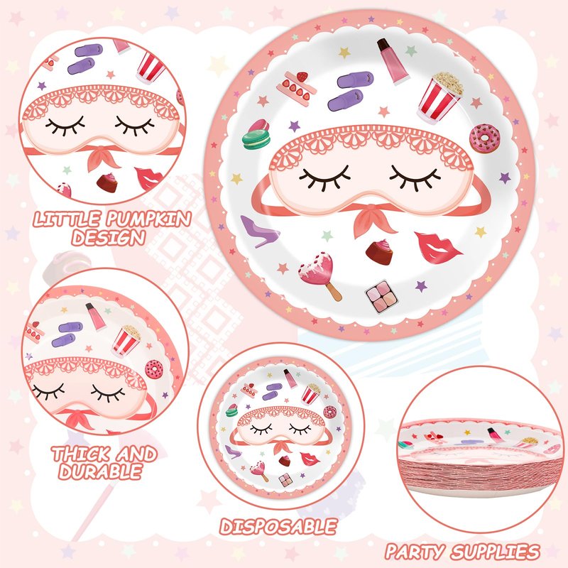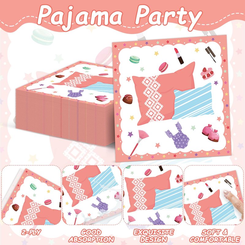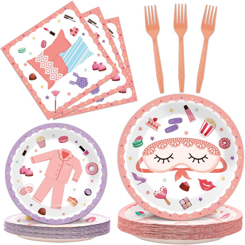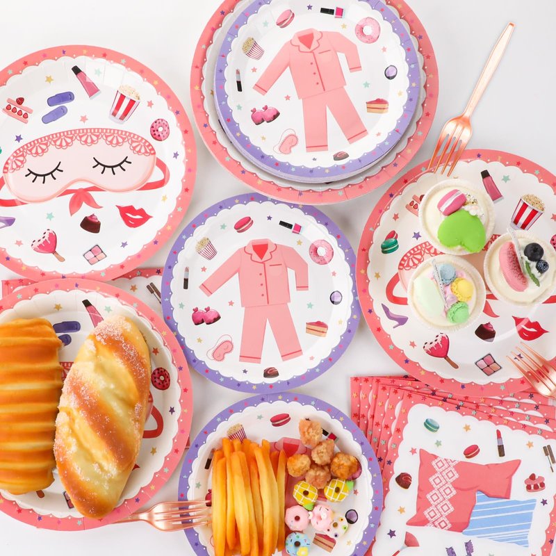 - Apply To:The sleepover party plates napkins are suitable for many occasions. Perfect for pajamas party, birthday party, wedding adding thick happy atmosphere.The pink pajamas tableware set will be the center of attention at the party, your friends and guests will love it!