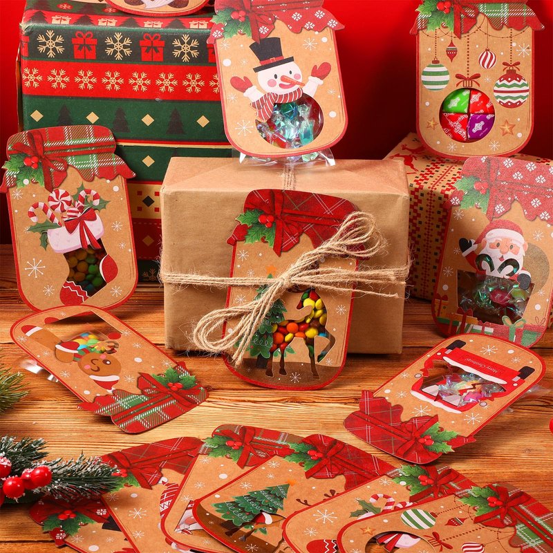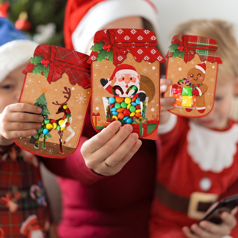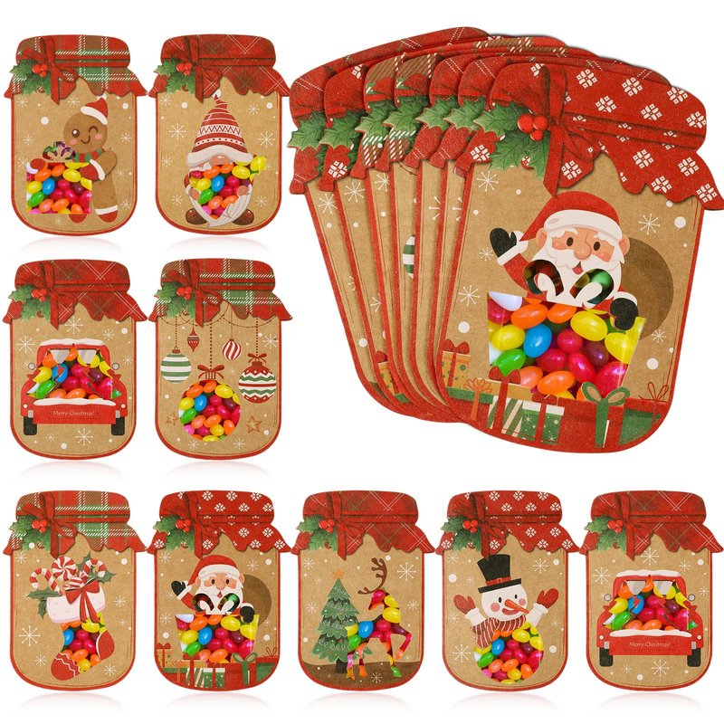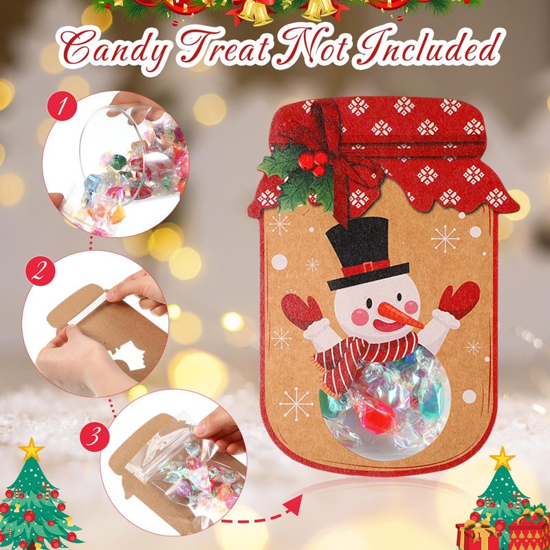 - Christmas Party Candy Bags: Our Christmas DIY favor set includes 48 pcs mason jar shaped cards in 8 designs, 48 transparent sealed goodie bags and 48 double sided glues. 50 plastic Christmas candy clear bag to put candies or small toys in and 50 tapes to secure the bags attach to the cards, a creative idea for a treat bag