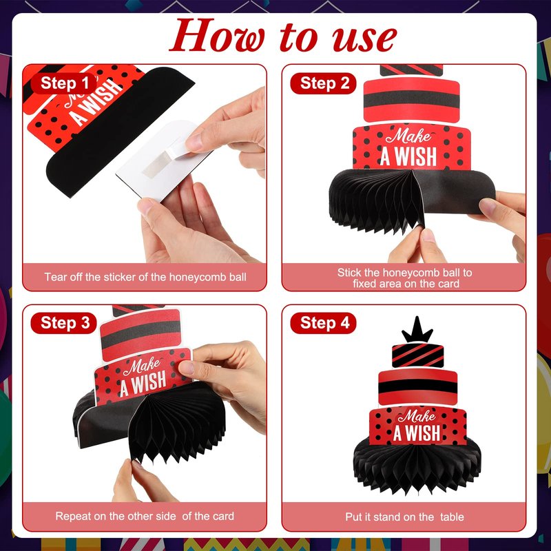 - Easy to Assemble: our red birthday table centerpiece decorations are reserved with stickers, you only need to tear off the honeycomb sticker, paste the honeycomb ball to the bottom of the card and fix it, and finally gently unfold the honeycomb ball by hand, which can complete the assembly, simple and convenient