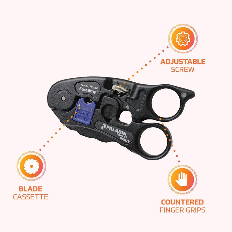 Paladin Tools PA1119 UTP/COAX Cable Stripper & Cutter - RG6, RG6 Quad, RG59 Coax, CAT5, CAT5E, CAT6, UTP/STP (2023 Model)