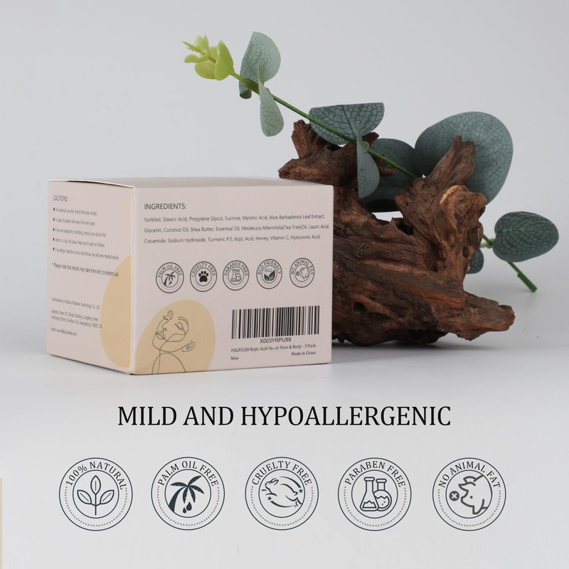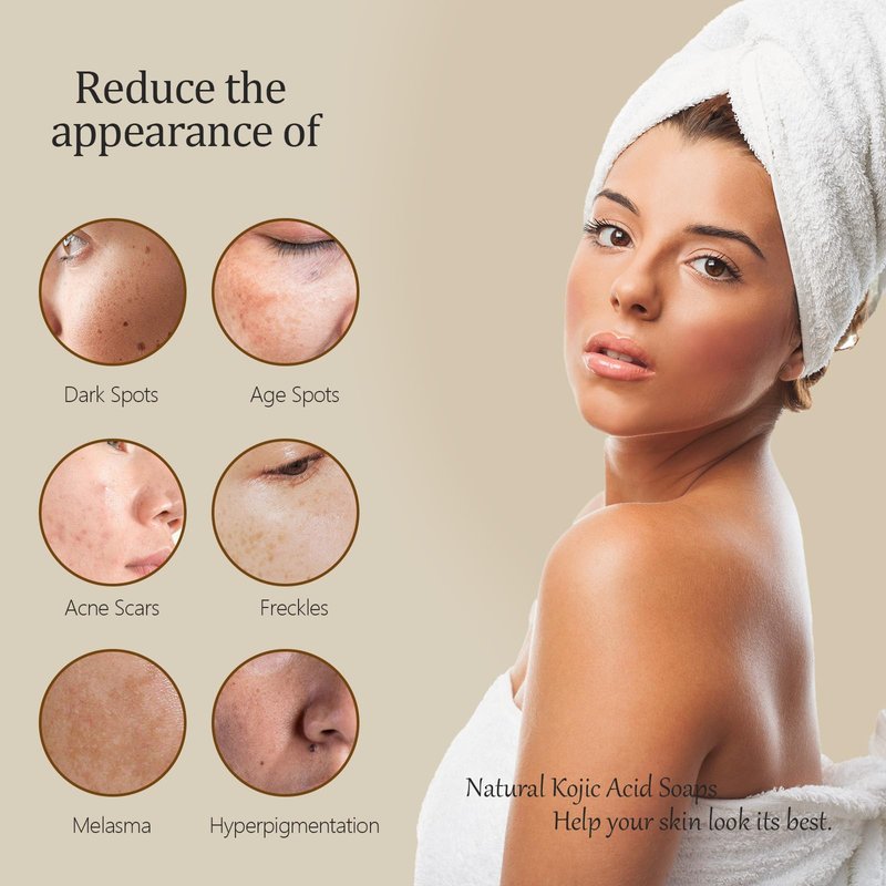 - Natural Kojic Acid Soap: Kojic acid is a naturally occurring skin-brightening compound found in nature; Our product has been proven safe and effective in gently smoothing away dark spots, discoloration, and other imperfections to reveal a softer and more even skin tone; It's important to note that individuals with darker skin tones may require a longer duration for skin lightening