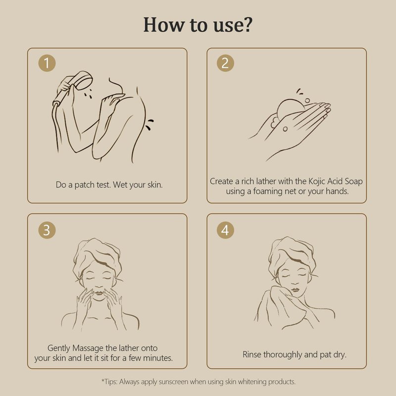 9. Frequency: Depending on your skin's sensitivity, you can use Kojic Acid Soap once or twice daily. Adjust usage according to your skin's needs;
