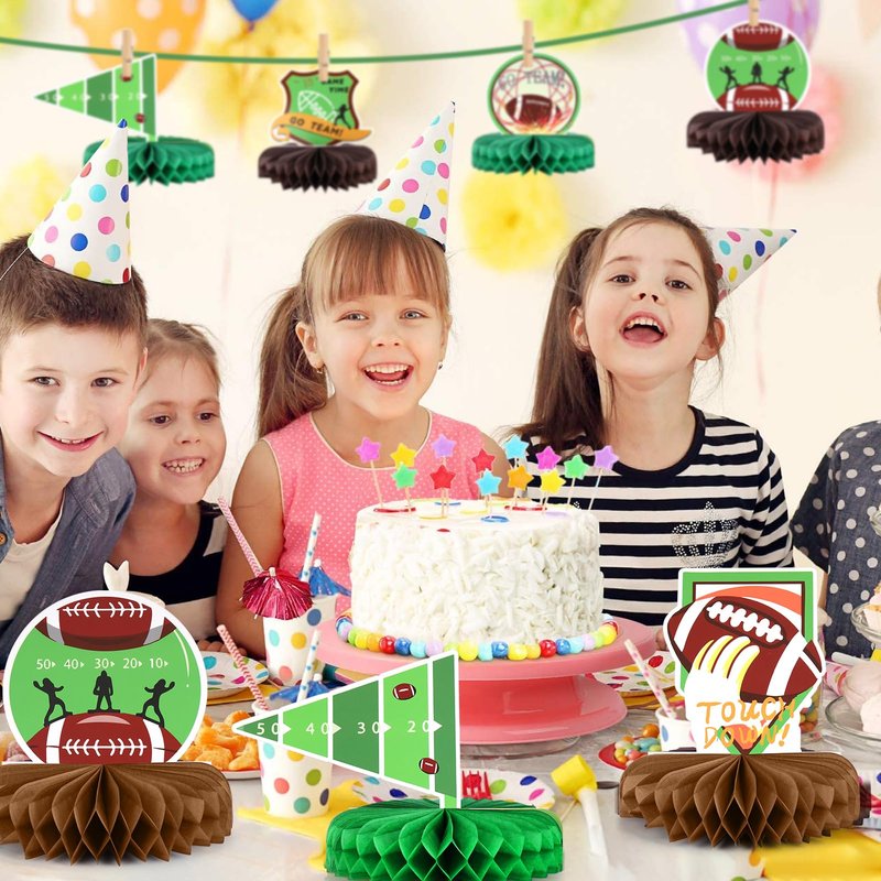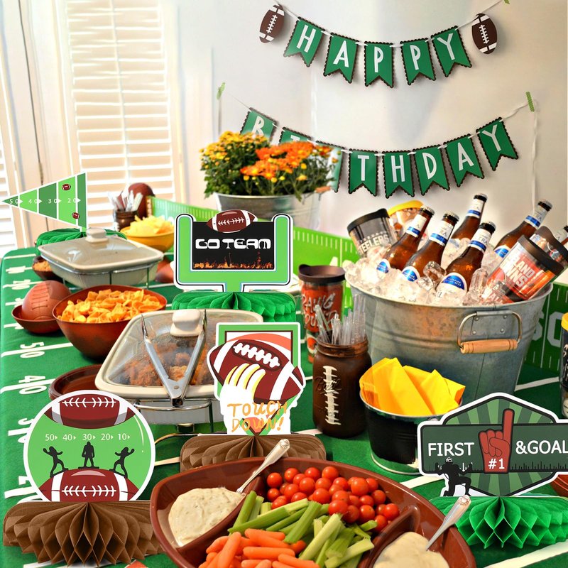 - šćRich StylećYou will get 10 pieces of football themed decorations including footballs, players, goalposts, helmets, football field, and more classic football elements, with the "Touch Down" and "Go Team" standing out. These football party decorations are rich in quantity and style, matching with diverse patterns of table decoration. The vibrant football themed birthday party supplies create a festival atmosphere.