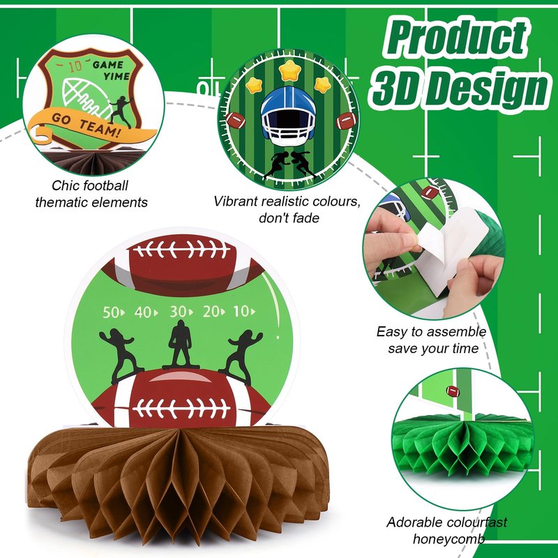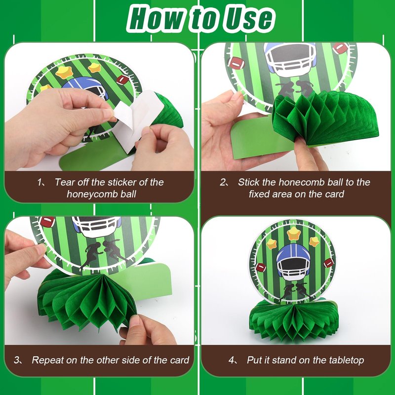 - šćEasy to AssemblećEach card is marked with an area for assembling honeycombs on. You can easily make them into 3D shape by removing the honeycomb ball's adhesive sticker and attaching it to the fixed area on the card. Repeat the process on the other side. Lastly, you can either stand it on a table. These football birthday decorations are so easy that you can save a lot of time.