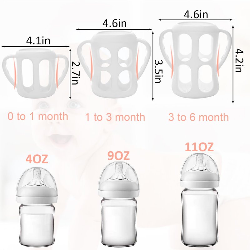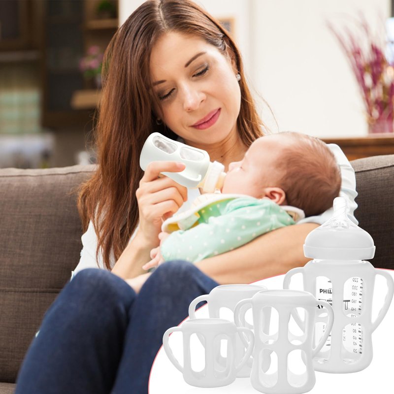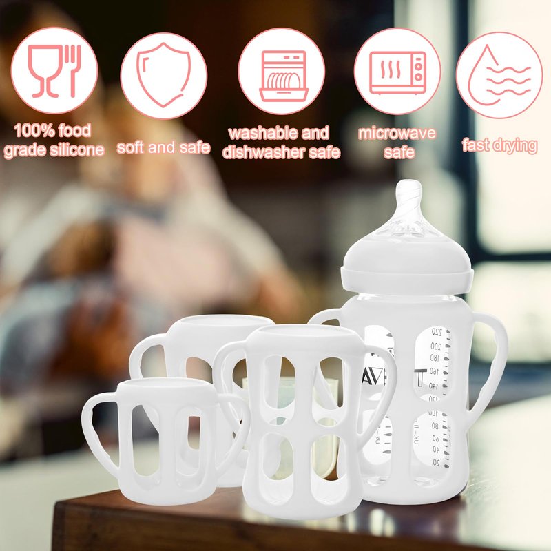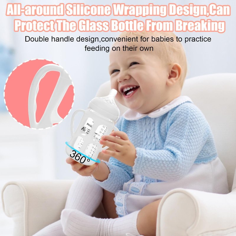 - Simultaneously meets dual needs: It is both a bottle protector and a handle, all-around silicone wrapping design, even if it slips, can protect the glass bottle from breaking(also protects the plastic bottle from being scratched), double handle design, convenient for babies to practice feeding on their own, freeing up the hands of the mother