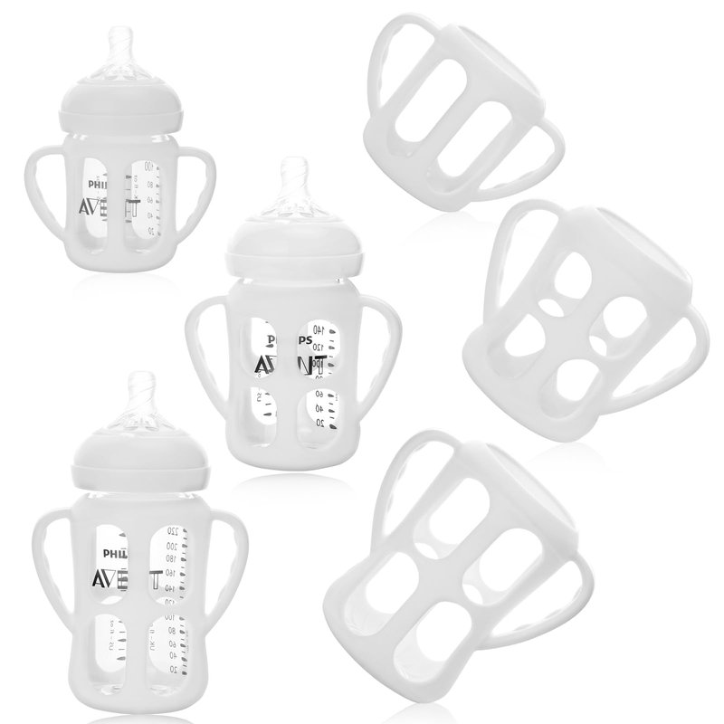 Palksky Baby Bottle Holder for Philips Avent Anti Colic Bottles and Natural Baby Bottle, 3 Pack (4oz, 8/9oz, 11oz) Silicone Anti-Fall Protective Case with Handle for Glass Bottle