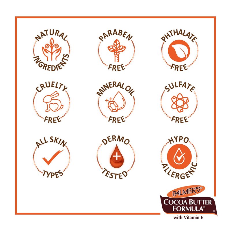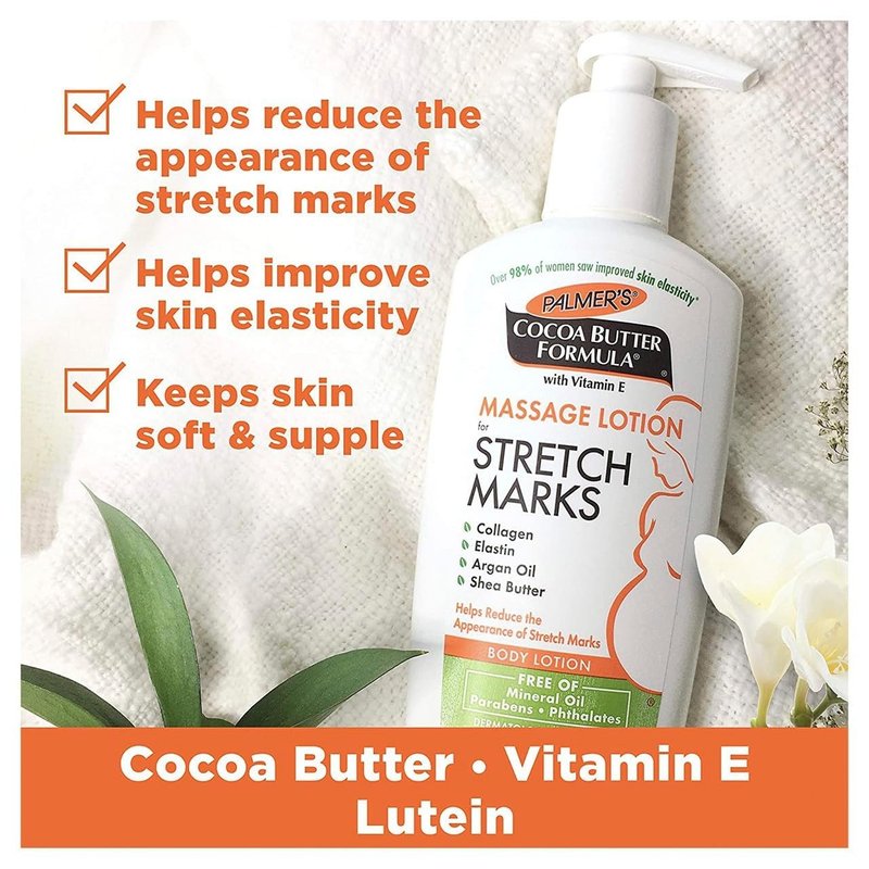 Over 98% of Women Saw Improved Skin Elasticity* With Vitamin E Collagen Elastin Argan Oil Shea Butter Helps Reduce the Appearance of Stretch Marks Free of Mineral Oil - Parabens - Phthalates Dermatologist Approved Hypoallergenic - Suitable for Sensitive Skin Made with Natural Vitamin E (Tocopherol) Palmer's is Against Animal Testing Family Owned & Operated Palmers Massage Lotion helps visibly improve skin elasticity and reduce the appearance of stretch marks. Pure Cocoa Butter and Shea Butter, Natural Oils, Collagen, Elastin and Lutein keep skin moisturized and supple for 48 hours allowing skin to stretch more easily. Widely recommended for stretch marks during and after pregnancy or weight fluctuation. This non-greasy lotion is ideal for all over body use, in place of your regular moisturizer. *Based on an 8 week in-home trial by 102 female panelists aged 18 to 49.