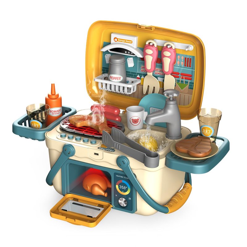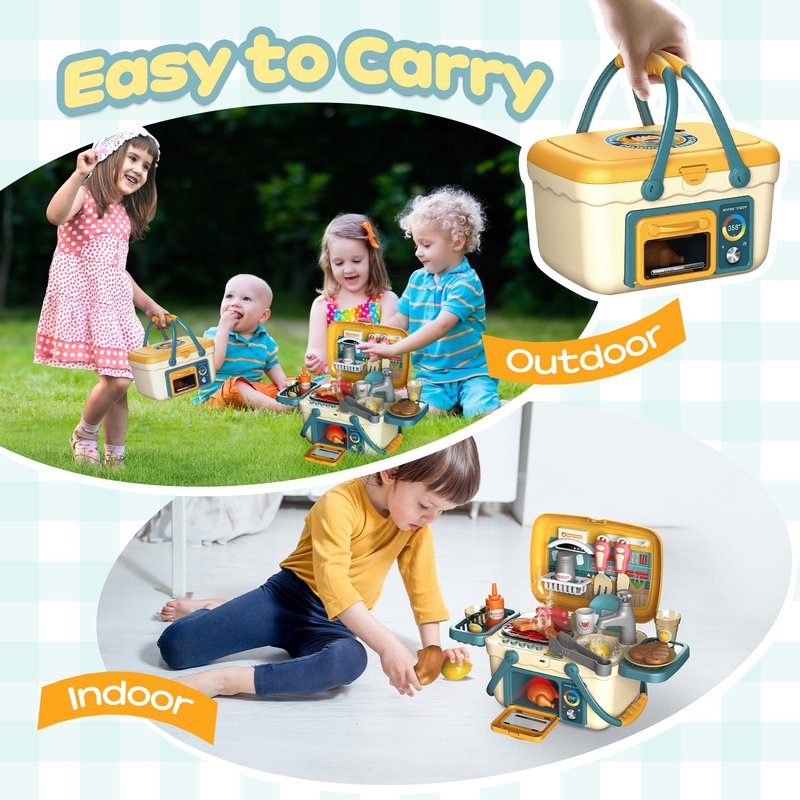 - 【Exquisite Design & Easy to Carry】 - PALYSOM kitchen toys are made of high-quality ABS plastic. Bright colors, cute designs and plenty of accessories make it fun for kids. The handhe design not only allows your kids to enjoy the play kitchen at home, but also easy to take it outdoors for picnic play.