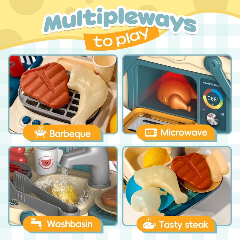 【Play Sink with Running Water】 - PALYSOM kitchen set for toddlers comes with a sink. Child can wash food and dishes by pushing the faucet. This sink toy set comes with a circulation system, the water in the sink will be recycled from the faucet, cultivate child's environmental awareness.