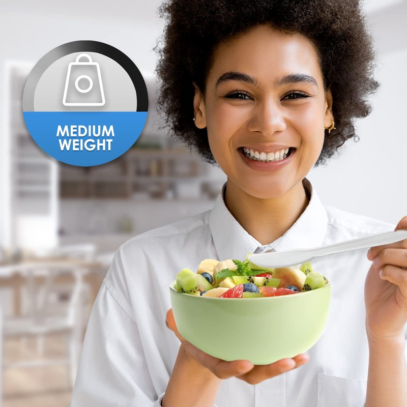 - PRACTICAL & STURDY MEDIUM-WEIGHT PLASTIC CUTLERY: Made of the highest quality, durable plastic materials, the PAMI plastic forks, soup spoons, teaspoons and knives are strong and sturdy to use with all different types of food. Zero bending, breaking or other annoyances so you can enjoy even heavy or dense foods with utmost comfort. Ideal for any course, from salads and fruits to meat dishes, pasta and dessert.