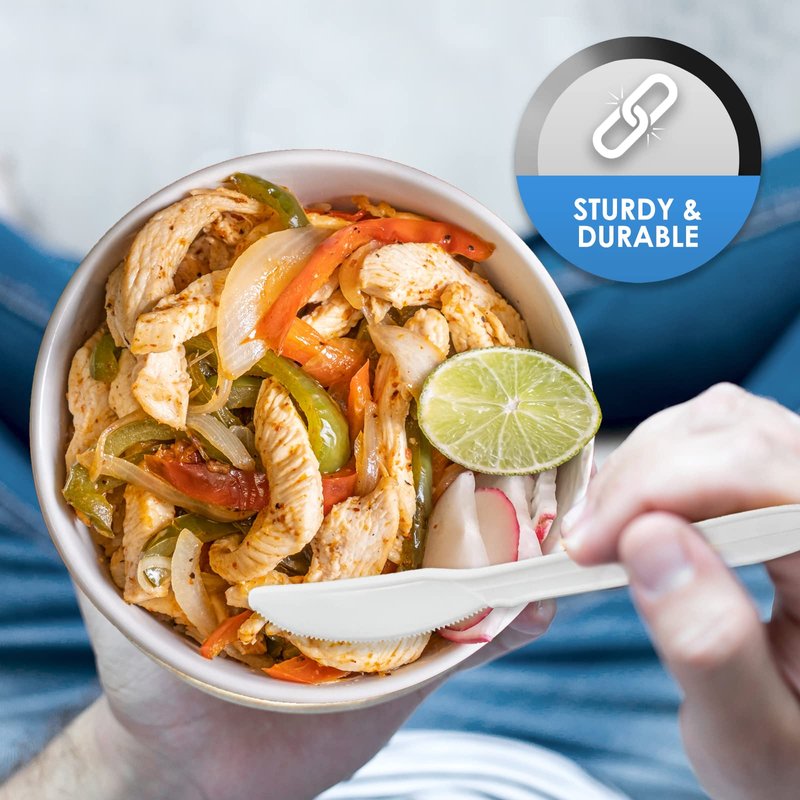 - MINIMAL DESIGN & DISPOSABLE FOR HASSLE-FREE CLEANING: Featuring a well-made, elegant design and a timeless white color, our plastic silverware will blend seamlessly with your tableware to match the décor of any party or fancy dinner table. Plus, our 100% recyclable, disposable cutlery sets make the after-party clean up a breeze!